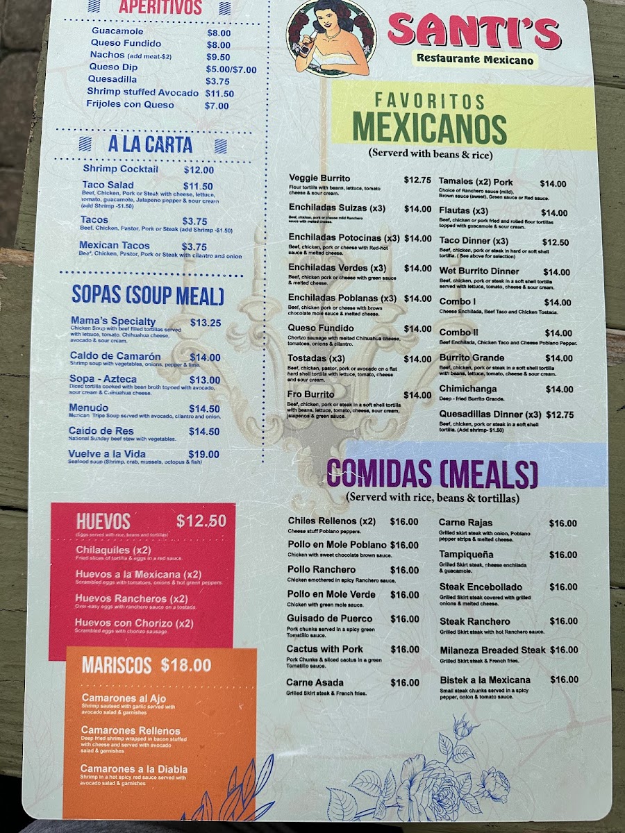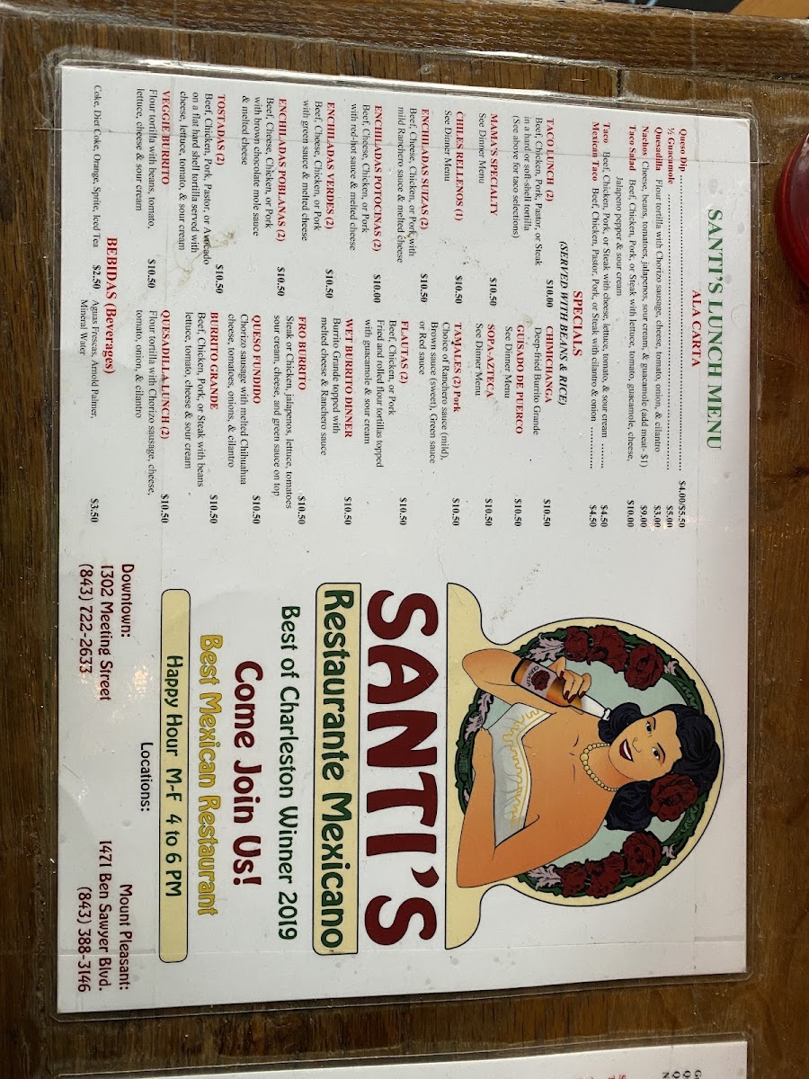 The Santi’s Mount Pleasant Menu offers a delightful mix of bold flavors and fresh ingredients, perfect for anyone craving authentic Latin-inspired dishes. Whether you're in the mood for savory tacos, sizzling fajitas, or a flavorful burrito, there's something for every palate. Each dish is carefully crafted, blending traditional spices with a modern twist that keeps customers coming back for more. With a relaxed atmosphere and friendly service, Santi's provides the ideal setting for a casual meal with family or friends. The menu also features a variety of appetizers, from crispy quesadillas to creamy guacamole, ensuring a satisfying start to your meal.
