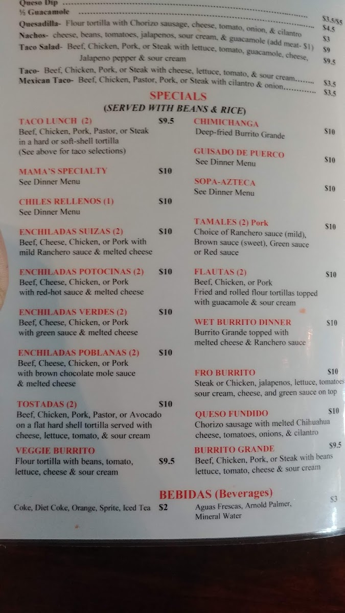 Beef, chicken, pork, or steak in hard or soft shell tortilla. Served with beans and rice.